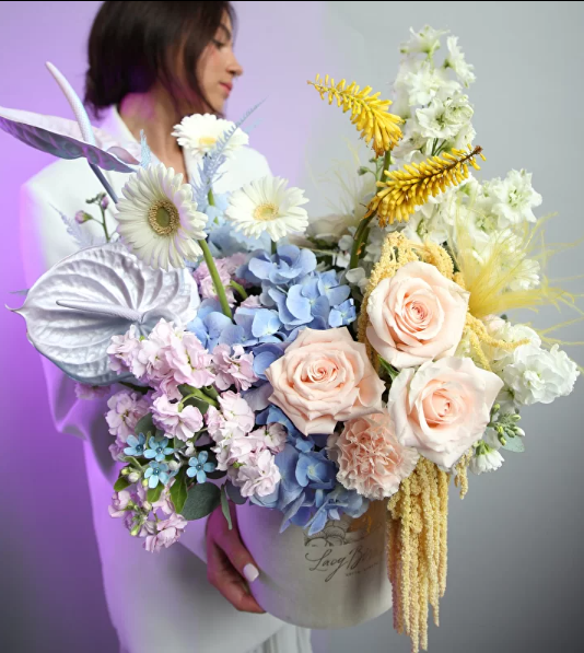 A warm and fiery bouquet of red, orange, and yellow roses, with autumn leaves.